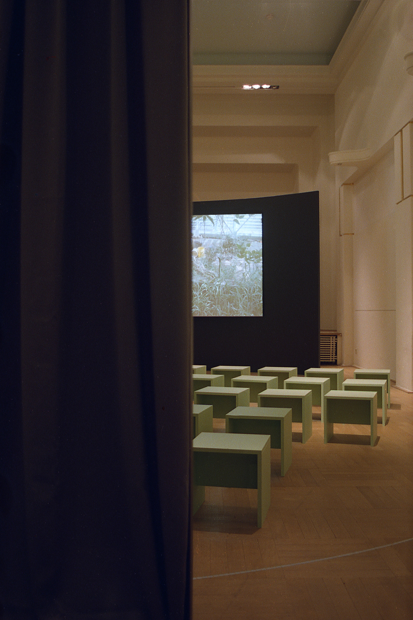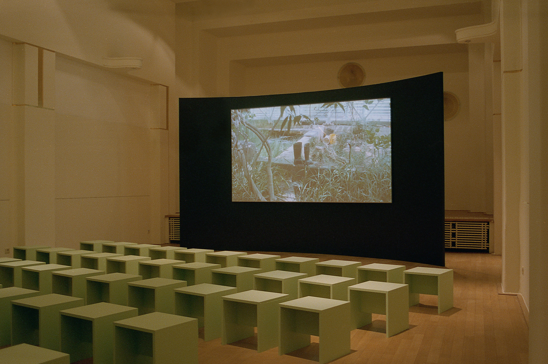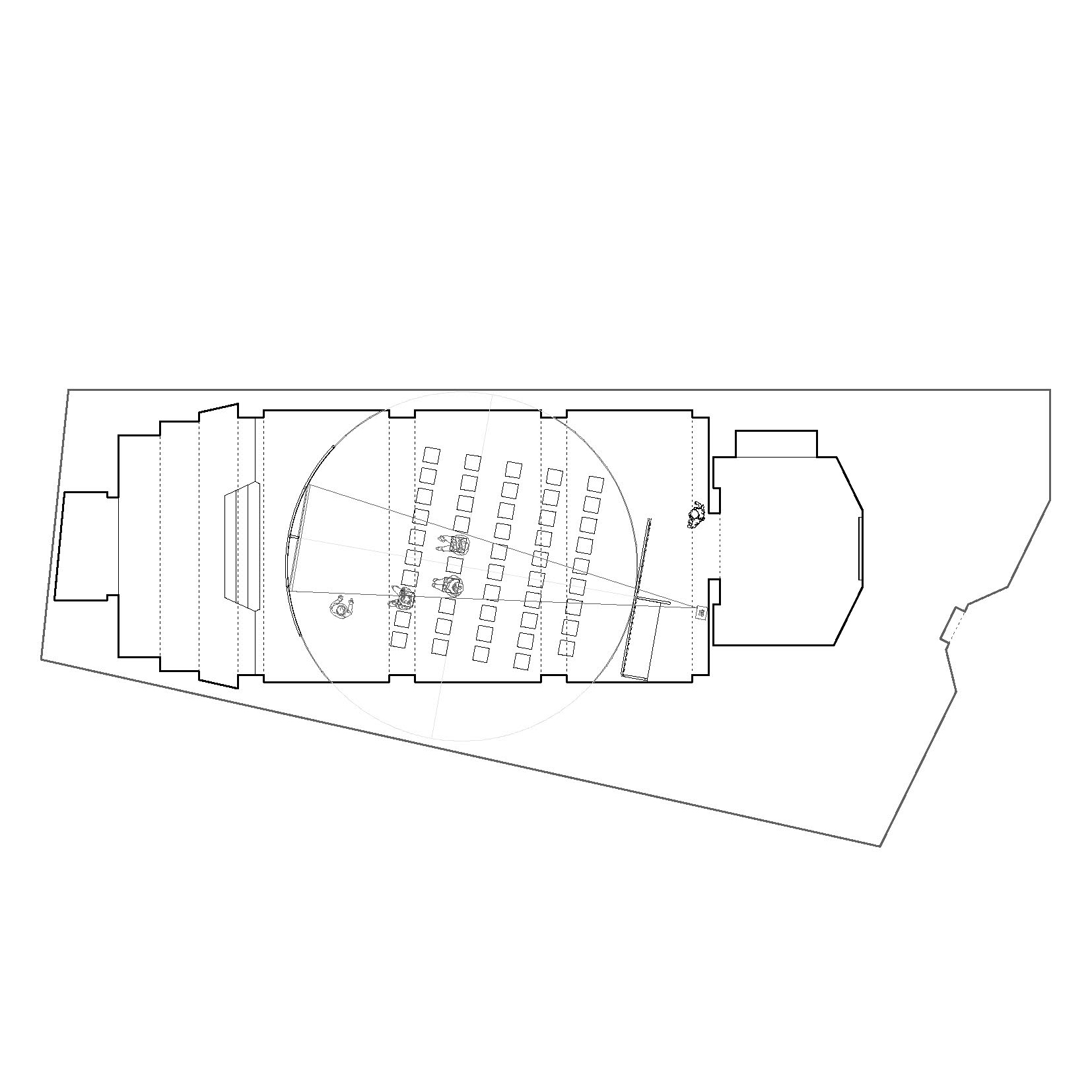 Set in the former temple of a masonic lodge, the public program constellations for futures hosted a series of events in various forms (lectures, film screenings, performances …). In relation to the aim to discuss consequences of the current crisis in a horizontal manner, the mono-directional characteristics of the provided room seemed misfit. In reaction, a new circular perimeter is introduced within the existing space, in the form of a curved wall holding a projection screen, an orthogonal frame structure housing technical support, and a line directly drawn on the floor.
