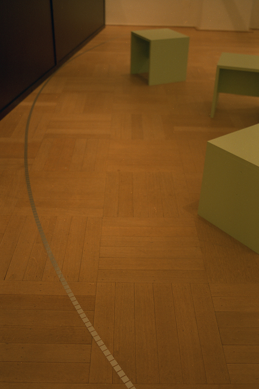At first glance, the installation may present itself as a foreigner to the building. Yet further observations prove otherwise. The diameter of the circle, seemingly too large to fit in the room, perfectly meets the size of the extremities of the building itself. The two wooden structure stand in an oblique manner within the room, but parallel to the outlining wall of the existing building. Even the pattern of the silver line on the floor take reference to the tiled ornamental floors found in the rest of the building. In such way, the scenographic installation plays the two contradictory roles of distancing and connecting itself from the existing space, allowing itself to mark its own place within the building without depending on the room itself.