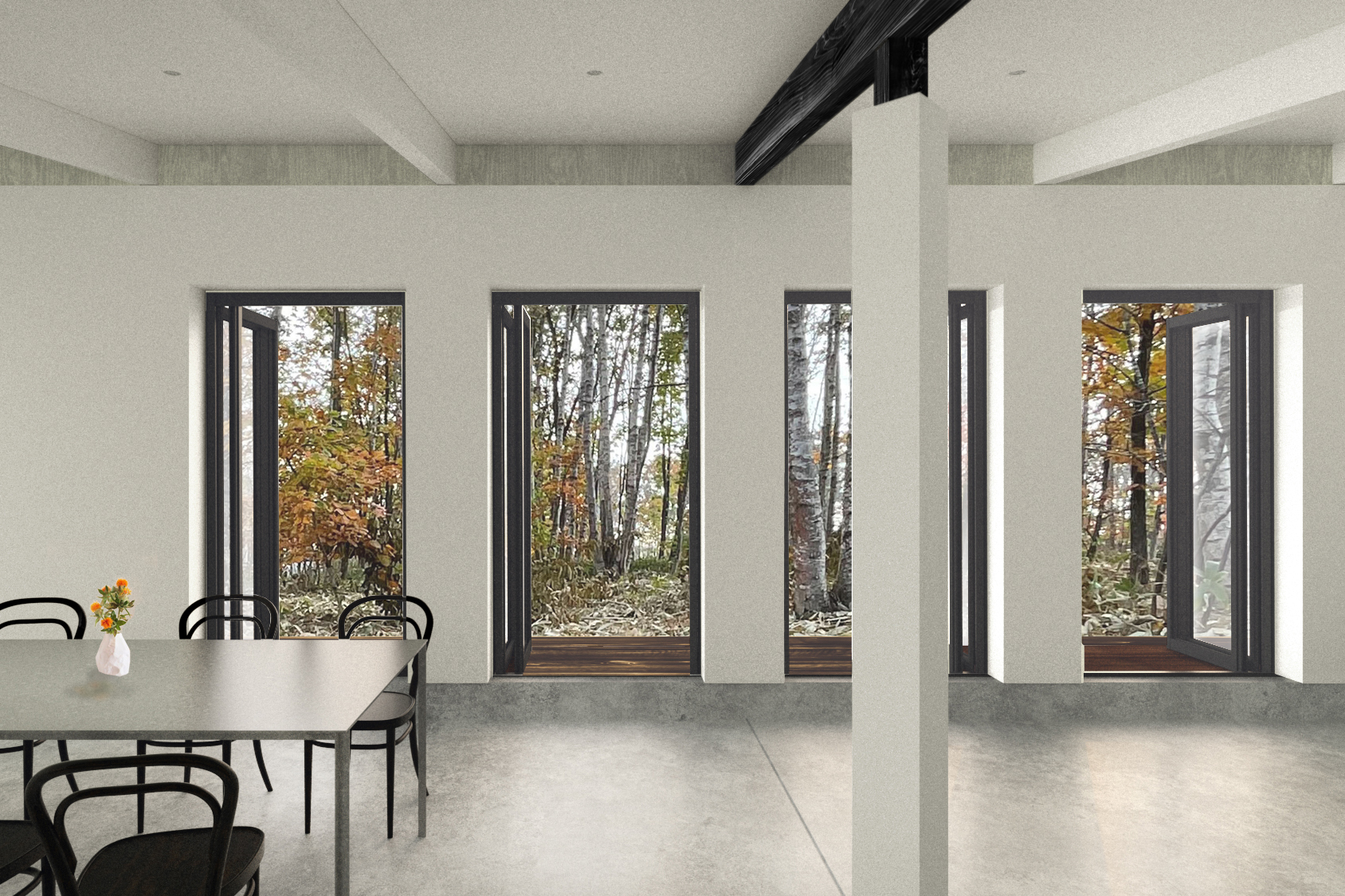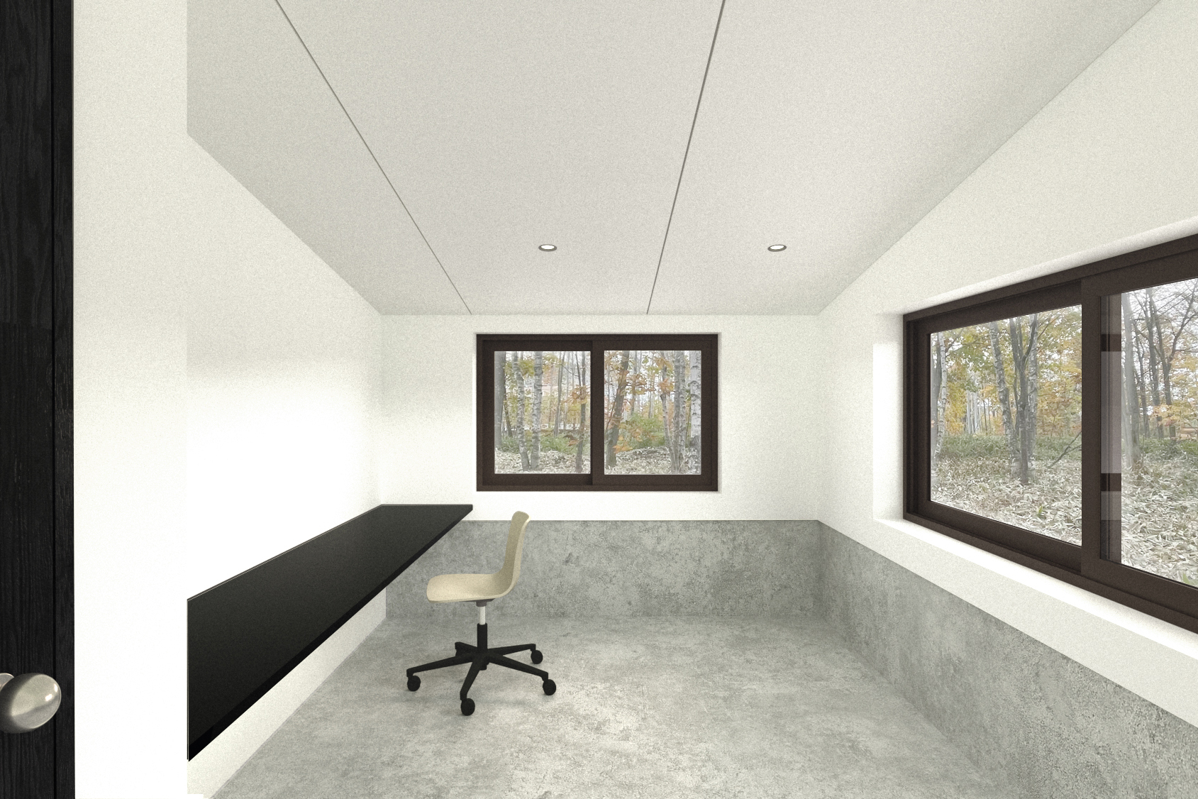 Located in the northernmost prefecture of Japan, the house is planned in a land that looks like a place of solitude, remotely placed in the midst of tall trees. But in reality the entire area planned to be divided into numerous plots where individuals plan their private residences and holiday houses, the plot surrounded by neighbors. It seems almost as a land of false pretenses, where one plans a life of solitude in nature, yet not quite ready to give up the convenience of being close to the city, thus being surrounded by unwanted neighbors of whom they deny their existence.