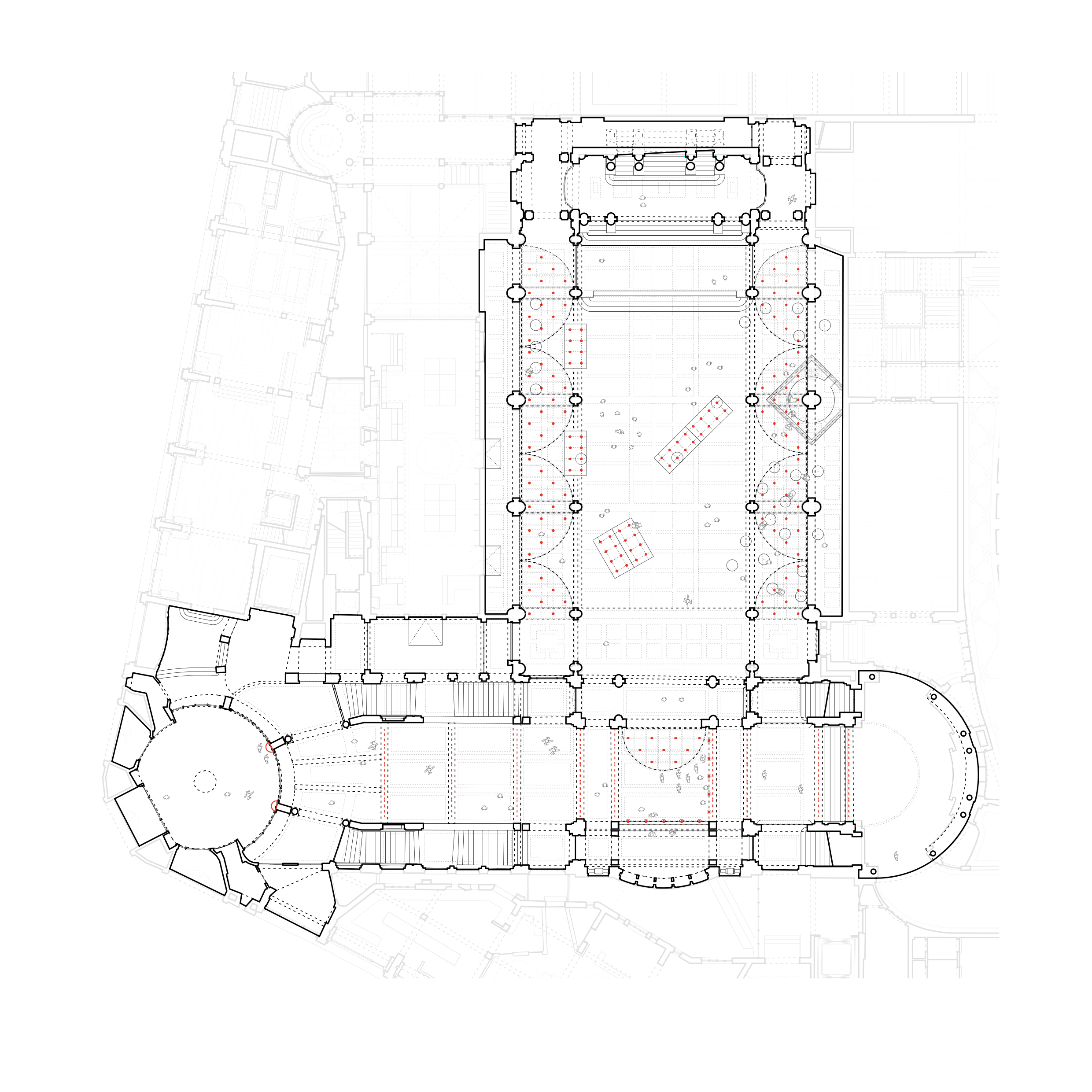 The new canopies are also a climatic device – integrated hydraulic tubes heat/cool the hall both actively and passively through either direct radiation or the thermal mass of the hall. Our proposal is thus both spatial and climatic, focusing on providing human conditions primarily in the perimeters of the hall in order to allow its central atrium to flourish as a true urban space, revealing the full potential of the hall originally designed by Victor Horta.